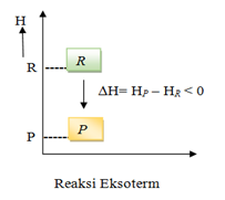 Pada reaksi eksoterm, sistem melepas energi. Oleh karena itu, entalpi akan berkurang, artinya entalpi produk (Hr) lebih kecil daripada entalpi pereaksi (Hr). Akibatnya, perubahan entalpi, yaitu selisih antara entalpi produk dengan entalpi pereaksi (Hp–Hr) bertanda negatif