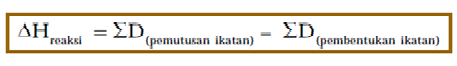 Untuk memutuskan ikatan diperlukan energi. Sebaliknya, untuk membentuk ikatan dilepaskan energi. Selisih energi pemutusan dan pembentukan ikatan menyatakan perubahan entalpi reaksi tersebut, yang dirumuskan sebagai berikut: