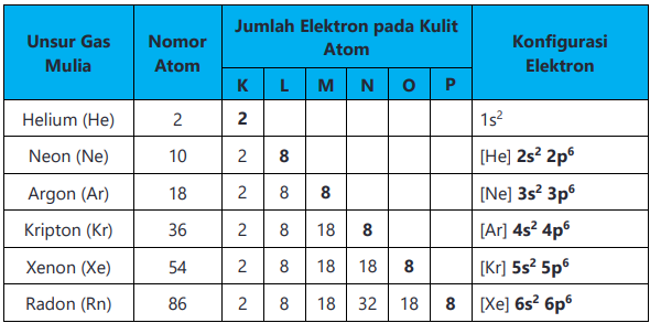 Berikut ini adalah tabel unsur gas mulia: