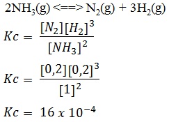 Pada kesetimbangan tersebut terdapat 0,01 mol N2, 0,01 mol H2, dan 0,05 mol NH3. Nilai tetapan kesetimbangan reaksi adalah....