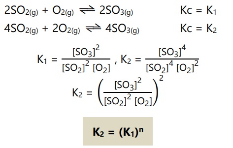 - Jika koefisien reaksi kesetimbangan dikali faktor n, maka harga Kc dipangkat n.