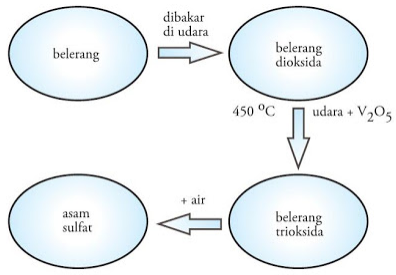 - Belerang dibakar dengan oksigen menghasilkan belerang dioksida.