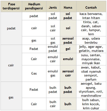 Contoh: tinta, cat, darah, sabun, asap, jelly, susu, santan, awan, kabut, busa, krim kocok, sitoplasma.