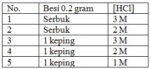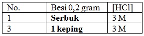 Pada percobaan nomor 1, besi 0,2 gram yang digunakan berbentuk serbuk, sedangkan pada percobaan nomor 3, besi 0,2 gram yang digunakan berbentuk kepingan. Hal itu menandakan bahwa meski konsentrasi HCl yang digunakan sama, yaitu 3 M, terdapat perbedaan pada luas permukaan besi 0,2 gram yang digunakan.