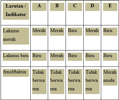 Tabel berikut merupakan data pengujian beberapa larutan menggunakan beberapa indikator.