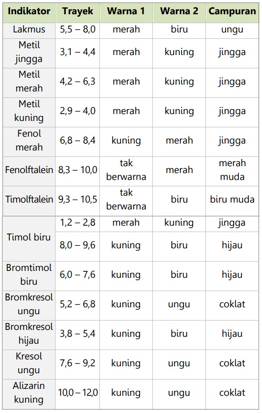 Warna indikator asam-basa berubah secara gradual dari pH ke pH dan memiliki trayek perubahan warna. Trayek perubahan warna adalah batas-batas pH dimana indikator mengalami perubahan warna.