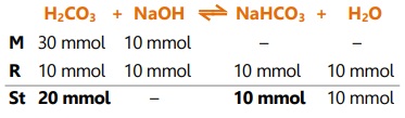 H2CO3(aq) + OH-(aq) --> HCO3-(aq) + H2O(l) - Penyangga hemoglobin tersusun atas HHb dan HbO2 dan berada pada darah.