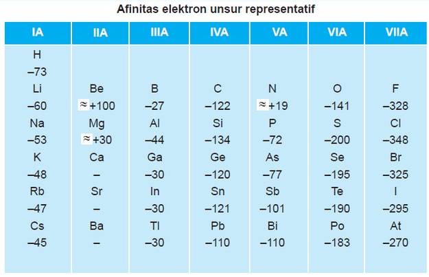 Berbeda dengan energi ionisasi, afinitas elektron dapat berharga positif atau negatif. Jika satu elektron ditambahkan kepada atom yang stabil dan sejumlah energi diserap maka afinitas elektronnya berharga positif. Jika dilepaskan energi, afinitas elektronnya berharga negatif. Contohnya, ketika gas klor menerima elektron untuk membentuk ion negatif.