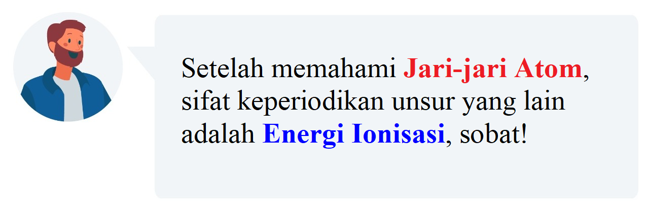 Sifat keperiodikan unsur meliputi jari-jari atom, energi ionisasi, afinitas elektron, dan keelektronegatifan