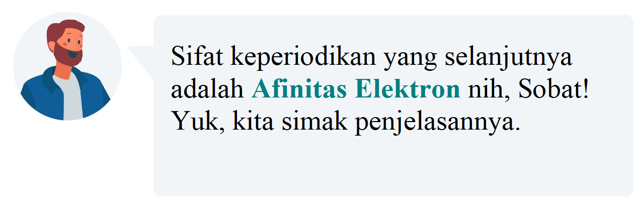 Afinitas elektron adalah besarnya energi yang dibebaskan satu atom netral dalam wujud gas pada waktu menerima satu elektron sehingga terbentuk ion negatif. Jika energi ionisasi selalu ditekankan pada pembentukan ion positif. Afinitas elektron ditekankan pada ion negatif, dan keduanya banyak dipakai untuk unsur-unsur pada golongan 6 dan 7 pada tabel periodik. Dalam satu golongan dari atas ke bawah, afinitas elektron semakin berkurang. Sedangkan dalam satu periode dari kiri ke kanan, afinitas elektron semakin bertambah.