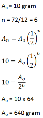 Suatu unsur radioaktif meluruh dalam waktu 72 hari dengan waktu paruh 12 hari, massa awal unsur tersebut jika massa yang tersisa 10 gram adalah ....