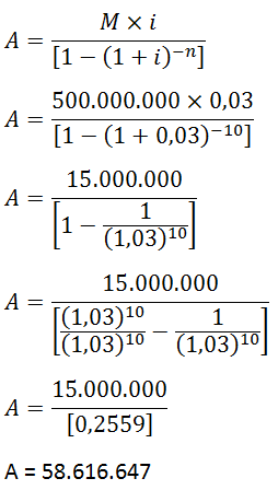 Bintang membeli rumah dengan menggunakan sistem anuitas pada pembayaran kreditnya. Harga rumah tersebut adalah Rp 500.000.000,- dengan suku bunga 3% per tahun. Bintang berniat melunasi kreditnya dengan 10 kali anuitas. Besar anuitas yang harus dibayar Bintang adalah ....