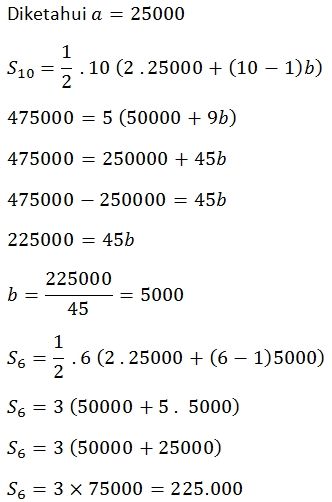Seorang penjahit akan diberikan upah sebesar Rp 25.000,00 pada pakaian pertama yang dihasilkan. Penjahit akan mendapatkan tambahan upah setiap menghasilkan pakaian baru dalam sehari. Jika dalam sehari penjahit bisa menyelesaikan 10 pakaian, Ia akan menerima upah Rp 475.000,00. Upah yang diterima penjahit jika Ia hanya bisa menyelesaikan 6 pakaian adalah ....