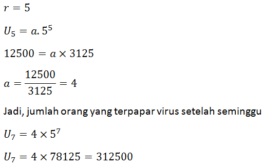 Penularan virus corona pada hari ke 5 setelah masuk ke suatu negara berjumlah 12500. Apabila setiap harinya terdapat lima kali lipat jumlah oraang yang terpapar virus tersebut, maka setelah satu minggu, jumlah orang yang terpapar virus tersebut adalah ....