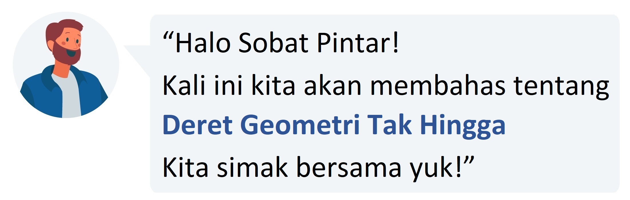 Berbeda dengan deret geometri sebelumnya yang memiliki banyak suku yang berhingga, deret geometri tak hingga merupakan penjumlahan dari suku-suku pada barisan geometri dengan rasio tertentu yang banyak sukunya tak terhitung.