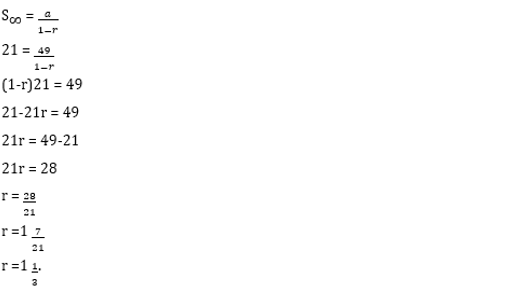 Diketahui suku pertama deret geometri adalah 49 dan jumlah tak hingga dari deret tersebut adalah 21, tentukan rasionya!