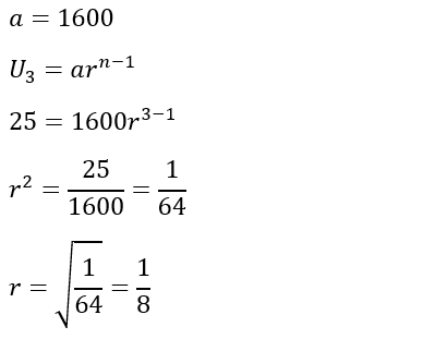 Suku pertama pada barisan geometri adalah 1600. Jika suku ketiga pada barisan tersebut adalah 25, maka rasionya yaitu ....