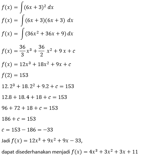 Jika f'(x)=(6x+3)2 dan f(2)=153, maka f(x) adalah ....