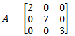 - Matriks diagonal, yaitu matriks persegi yang semua elemennya nol, kecuali elemen pada diagonal utamanya bukan nol. Contoh :