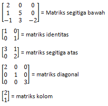 - Matriks identitas, yaitu matriks persegi yang elemen pada diagonal utamanya adalah satu, sedangkan elemen lainnya adalah nol. Matriks identitas dilambangkan dengan “I”. Contoh :