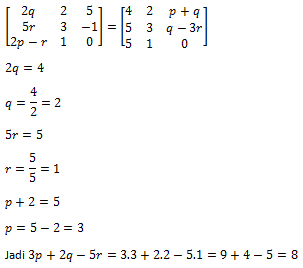 Jika A=B maka nilai 3p+2q-5r adalah....