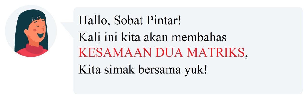 Dua matriks dikatakan sama (A=B), apabila mempunyai ordo yang sama dan elemen-elemen yang letaknya sama (bersesuaian) besarnya sama atau aij = bij.