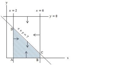 Maka berdasarkan gambar di atas, ada 4 titik ekstrim, yaitu A, B, C, D dan himpunan penyelesaiannya ada di area yang telah diarsir