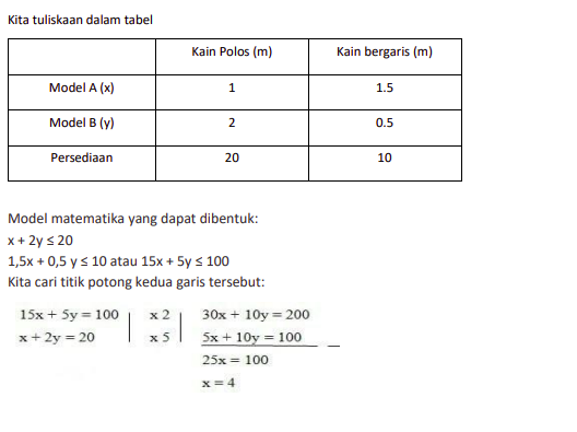 Seorang tukang jahit akan membuat pakaian model A dan model B. Model A memerlukan 1 m kain polos dan 1.5 m kain bergaris. Model B memerlukan 2 m kain polos dan 0.5 m kain bergaris. Persediaan kain polos 20 m dan bergaris 10 m. Banyaknya total pakaian jadi akan maksimal jika banyaknya model A dan model B masing-masing ....