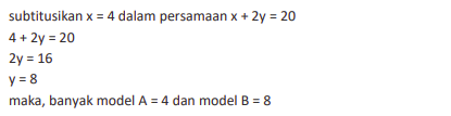 Jadi, model matematikanya adalah: x > 0 , y > 0 , 3x + 5y = 350.000 dan x + y = 90.000