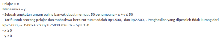 Sebuah angkutan umum paling banyak dapat memuat 50 penumpang. Tarif untuk seorang pelajar dan mahasiswa berturut-turut adalah Rp1.500,- dan Rp2.500,-. Penghasilan yang diperoleh tidak kurang dari Rp75.000,-. Misal banyak penumpang pelajar dan mahasiswa masing-masing x dan y. Model matematika yang sesuai untuk permasalahan tersebut adalah ....