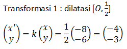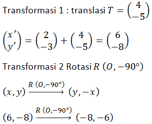 Berbeda dengan materi sebelumnya yang hanya melewati satu kali transformasi, pada materi kali ini kita akan belajar tentang komposisi transformasi, yaitu hasil dari perubahan letak atau ukuran yang diubah kembali letak atau ukurannya. Komposisi transformasi dilambangkan dengan simbol “o” yang terletak diantara dua transformasi.