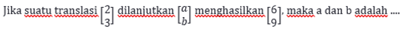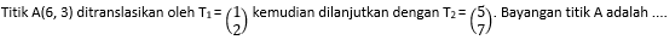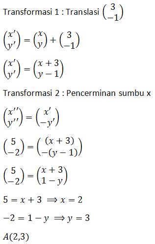 Bayangan titik A jika ditranslasikan oleh T(3,-1) dan dilanjutkan pencerminan terhadap sumbu x adalah (5,-2). Koordinat titik A adalah….