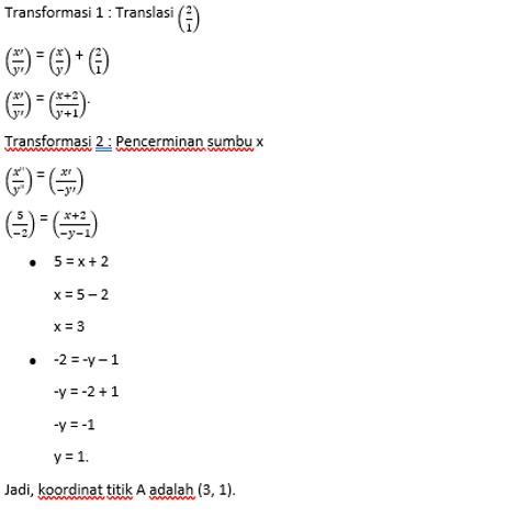 Bayangan titik A jika ditranslasikan oleh T(2, 1) dan dilanjutkan pencerminan terhadap sumbu x adalah (5,-2). Koordinat titik A adalah ....