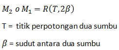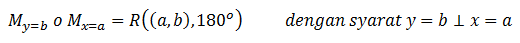 Pencerminan terhadap dua sumbu yang saling tegak lurus sama dengan rotasi sejauh 180o dengan pusat perpotongan dua sumbu, sehingga dapat dinyatakan: