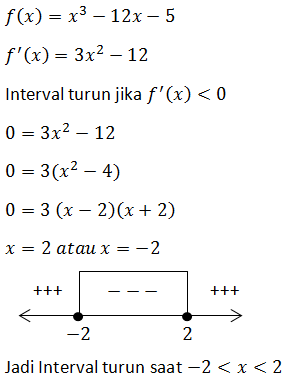 Interval turun dari fungsi x3 - 12x - 5 adalah ....