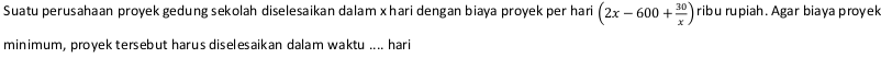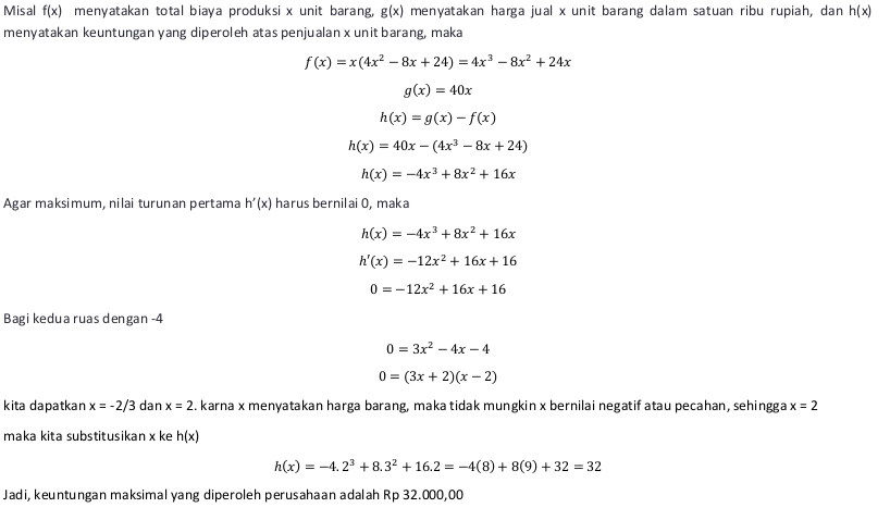 Suatu perusahaan memproduksi x unit barang dengan biaya 4x2 - 8x + 24 ribu rupiah untuk tiap unit. Jika barang tersebut terjual habis dengan harga Rp 40.000,00 untuk tiap unit, maka keuntungan maksimum yang diperoleh perusahaan tersebut adalah ....