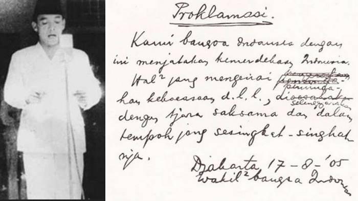 Sukarno pertama kali menuliskan kata pernyataan “Proklamasi”. Soekarno kemudian bertanya kepada Moh. Hatta dan Ahmad Subarjo.“ Bagaimana bunyi rancangan pada draf pembukaan UUD?” Kedua orang yang ditanya pun tidak ingat persis. Ahmad Subarjo kemudian menyampaikan kalimat “Kami bangsa Indonesia dengan ini menyatakan kemerdekaan Indonesia”. Moh. Hatta menambahkan kalimat: “Hal-hal yang mengenai pemindahan kekuasaan dan lain-lain diselenggarakan dengan cara saksama dan dalam tempoh yang sesingkat-singkatnya”. Sukarno menuliskan, “Jakarta, 17-8- ’05 Wakil-wakil bangsa Indonesia”, sebagai penutup. Mereka semua sepakat tentang draf itu.