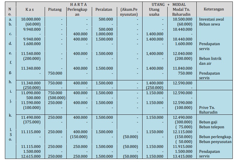 - Dibayar sewa atas ruangan usaha bengkel sebesar Rp60.000,00 untuk 1 bulan. Analisis : Harta (kas) berkurang Rp60.000,00 dan modal berkurang Rp60.000,00.