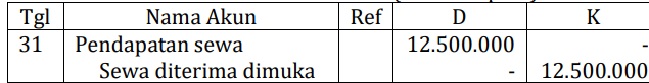 Pendapatan sewa (D) Rp12.500.000,00 ; Sewa diterima di muka (K) Rp12.500.000,00