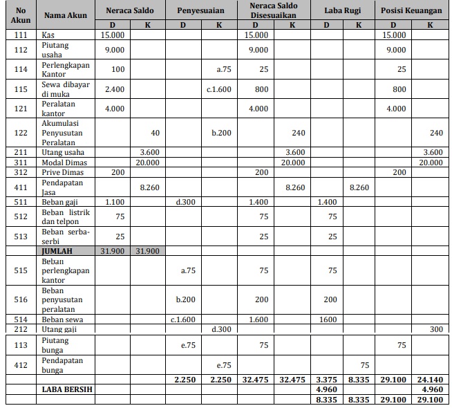 - Menggolongkan dan meringkas informasi dari neraca saldo dan data penyesuaian, sehingga merupakan persiapan sebelum menyusun laporan keuangan yang formal.