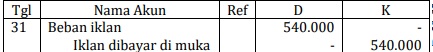 Beban iklan (D) Rp540.000,00 ; Iklan dibayar di muka (K) Rp540.000,00