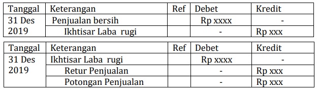Penjualan yang bersaldo kredit kita akan debet dan sedangkan akun Retur Penjualan dan Potongan Penjualan yang memiliki saldo debet akan di kredit. Selanjutnya selisih dari Penjualan dan Retur penjualan dan potongan Penjualan yang disebut penjualan bersih akan dikredit oleh akun ikhtisar laba rugi, jika dibuat dalam jurnal seperti terlihat di bawah ini: