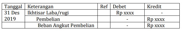 Pembelian dan beban pembelian yang bersaldo debet kita kredit dan mendebet akun Ikhtisar Laba/rugi, jika dibuat jurnal terlihat seperti di bawah ini: