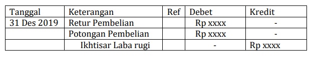 Akun retur pembelian dan potongan pembelian yang bersaldo kredit akan didebet oleh akun ikhtisar laba rugi. Jika dibuat jurnal akan terlihat seperti di bawah ini: