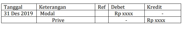 Akun prive yang memiliki saldo debet akan dikredit dan mendebit akun modal, jika dibuatkan jurnal terlihat seperti di bawah ini