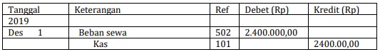 Beban sewa yang digunakan 1/12 x 2.400.000 = 200.000 Maka jurnal penyesuaiannya :