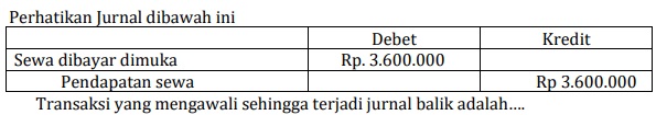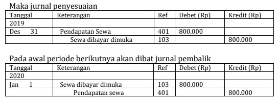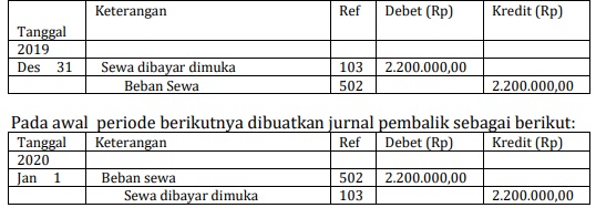 - Beban Dibayar di Muka. Beban telah dibayar yang dicatat sebagai beban pada akhir periode akan ditutup sehingga nilainya akan nol, oleh sebab itu pada awal periode berikutnya diperlukan jurnal pembalik agar data beban mencerminkan keadaan yang sebenarnya. Misalnya, pada 1 Desember 2019 dibayarkan uang sewa untuk 1 tahun sebesar Rp2.400.000, dicatat pada jurnalnya adalah sebagai berikut.