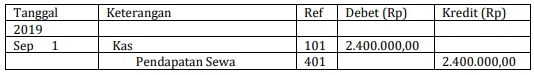 - Pendapatan diterima dimuka. Pendapatan sewa yang belum direalisasikan akan dicatat sebagai pendapatan. Di sini Jurnal pembalik dibuat untuk menjadikan pendapatan sebagai sewa diterima dimuka. Misalnya, pada 1 September 2019 perusahaan telah menerima pendapatan sewa sebesar Rp2.400.000,00 untuk 6 bulan. Jurnal yang dibuat saat transaksi adalah sebagai berikut.