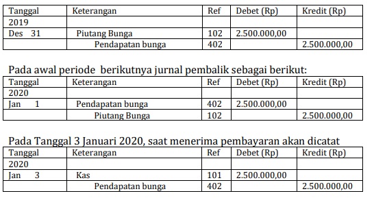- Pendapatan yang masih harus diterima. Pendapatan yang masih harus diterima merupakan tagihan dalam akun piutang dan pendapatan. Pada akhir periode akun piutang tersebut akan terbawa ke periode berikutnya, sedangkan akun akan ditutup sehingga saldonya nol. Oleh karena itu untuk menghilangkan akun piutang dan memunculkan kembali perkiraan pendapatan diperlukan jurnal pembalik. Contoh. Pada akhir periode diketahui perusahaan memiliki pendapatan bunga yang masih harus diterima dari simpanan di bank Rp2.500.000,00 yang akan diterima 3 Januari 2020, jurnal yang dibuat pada tanggal 31 Desember 2019 sebagai berikut: