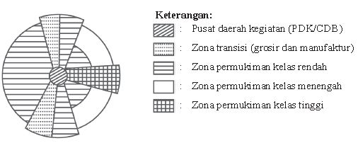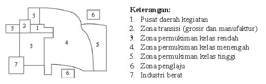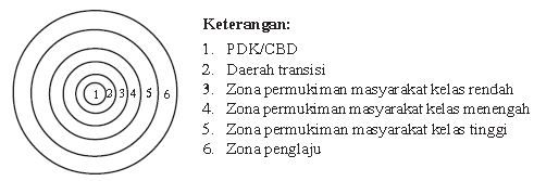 Dikembangkan oleh E.W. Burgess (1920), pola penggunaan lahan kota memperlihatkan zona-zona konsentrik (melingkar). Pusat dari zona tersebut merupakan inti kota, tempat paling ramai sebagai pusat kegiatan ekonomi. Semakin ke tepi, zona kegiatan ekonomi semakin sedikit. Sebaliknya, wilayah permukiman semakin banyak.